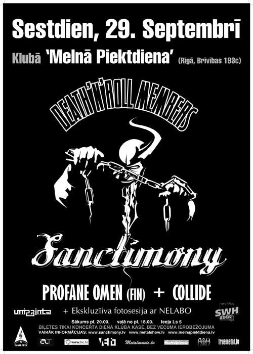 Sestdien, 29.septembrī, plkst.20.00 mūzikas klubā "Melnā piektdiena" notiks ceturtais "Death'n'roll members" pasākums, kurā grupa SANCTIMONY svinēs 13 gadu jubileju. Pasākumā uzstāsies arī grupa "Collide" (Rīga) un īpašie šīs jubilejas viesi "Profane Omen" (Somija).