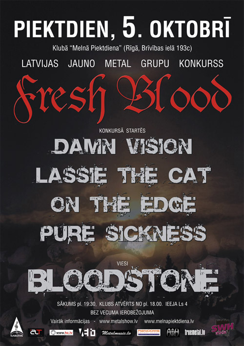 Piedāvājam jūsu vērtējumam grupas, kas sacentīsies kārtējā Latvijas jauno metal grupu konkursa „Fresh Blood” trešās sezonas pirmajā kārtā 5. oktobrī klubā „Melnā Piektdiena”!: