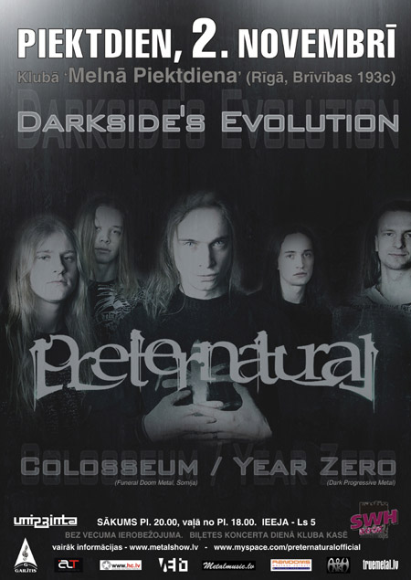 2. novembrī (piektdiena), klubā "Melnā Piektdiena" koncerts "Darksides Evolution", kurā ar plašu programmu uzstāsies pašmāju PRETERNATURAL, somu Funeral Doom vienība Colosseum, un vietējie Dark Progressive pārstāvji Year Zero!
