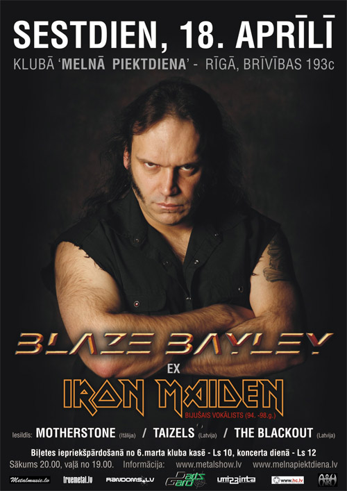 Sestdien, 18.aprīlī Rīgā, klubā "Melnā Piektdiena" uzstāsies ex Iron Maiden vokālista Bayley Cook grupa Blaze Bayley! (http://www.myspace.com/blazebayley, http://www.blazebayley.net)