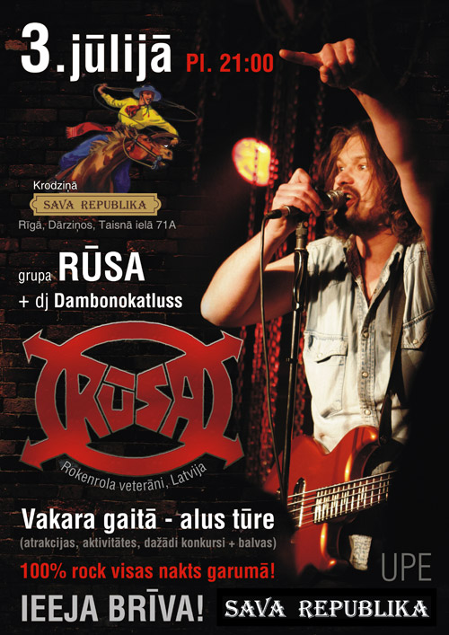 3. jūlijā (piektdiena) krodziņā "Sava Republika" grupa RŪSA + DJ Dambonokatluss.